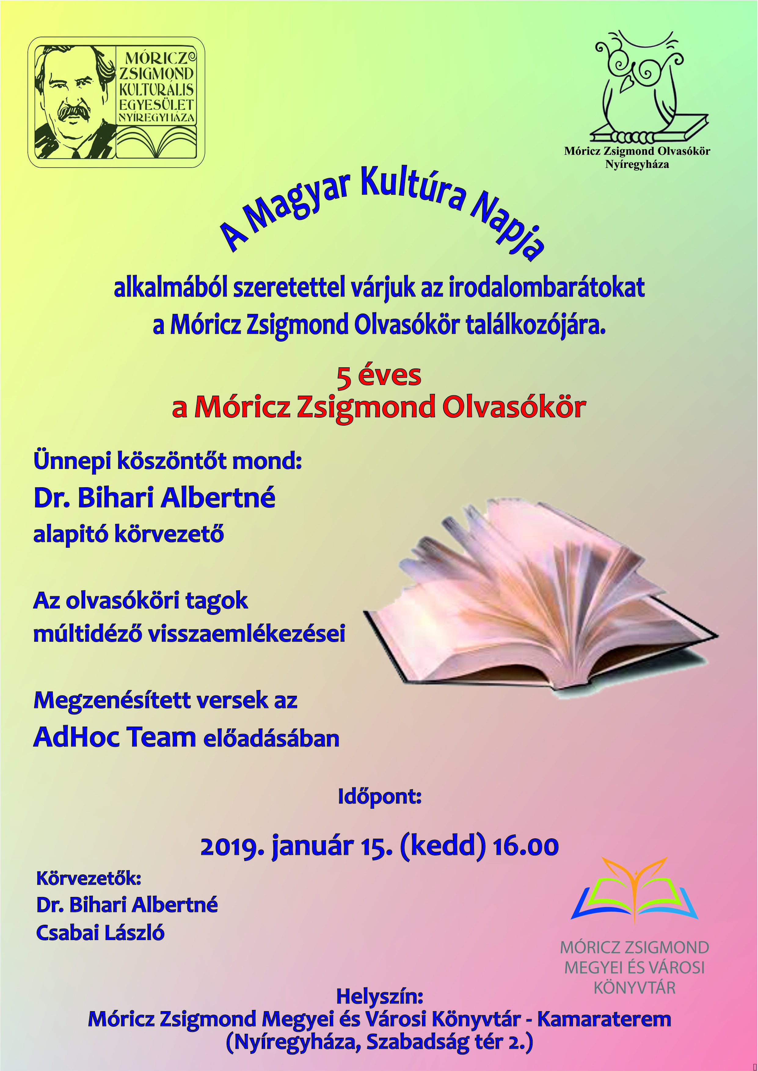 A Magyar Kultúra Napja alkalmából szeretettel várja az irodalombarátokat az idén 5 éves Móricz Zsigmond Olvasókör ünnepi találkozójára, január 15-én, kedden 16 órától a könyvtár Kamaratermébe. Az eseményen ünnepi köszöntőt mond dr. Bihari Albertné alapitó körvezető. Ezt követően az olvasóköri tagok idézik fel az elmúlt 5 év emlékezetes pillanatait, majd a nemrég alakult AdHoc Team megzenésített versekkel teszi még emlékezetessebbé ezt a különleges találkozót.