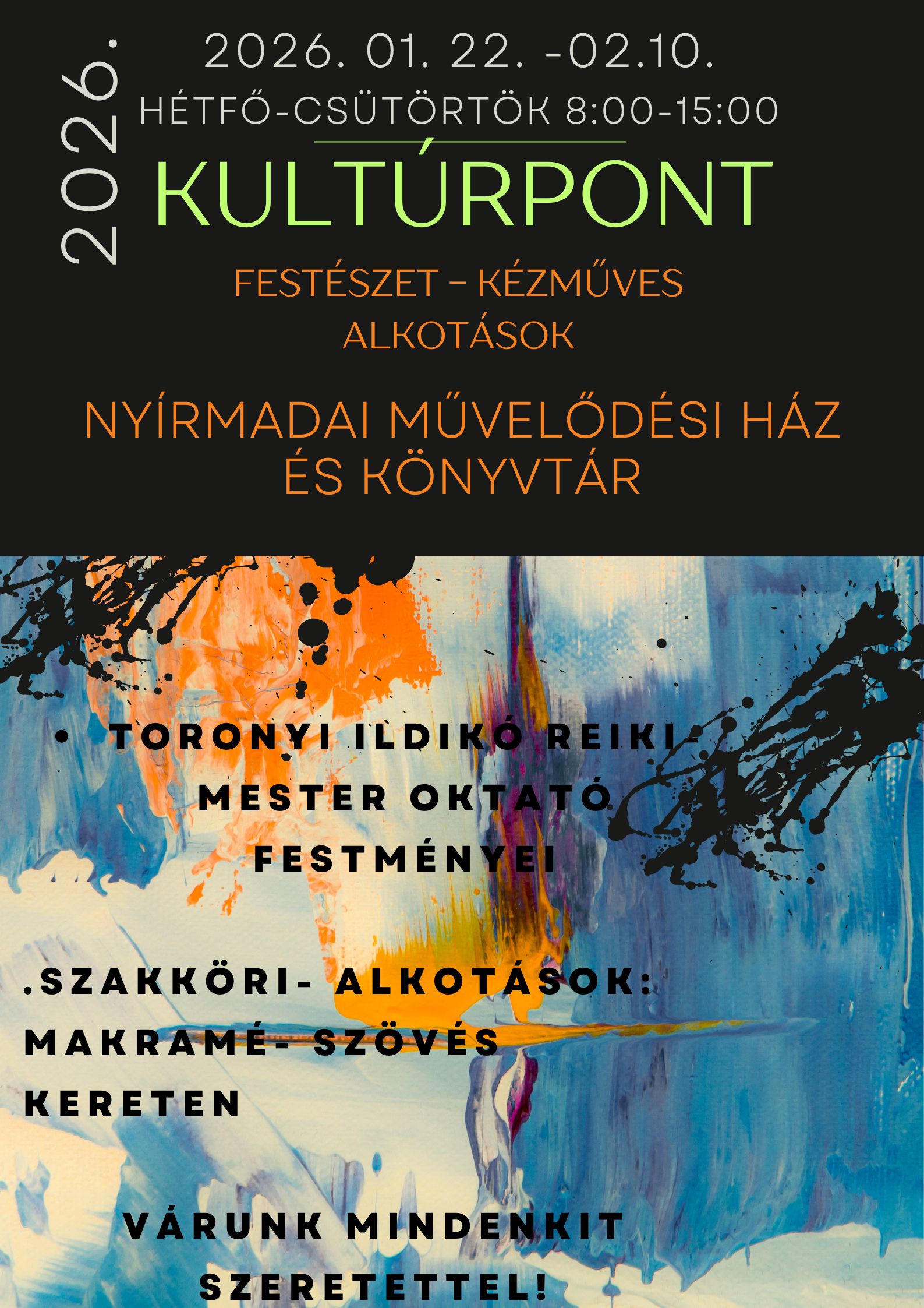 Toronyi Ildikót saját bevallása szerint mindig is érdekelte az a nem látható tér, amely körülvesz minket. 20 éve foglalkozik ezzel a világgal és 2025 októberében jött egy érzése, hogy festenie kell. Kezdetben mindezt ecsettel tette, majd következett az intuíció alapú ujjfestés. Célja, hogy mind a felnőttekhez, mind pedig a gyerekekhez eljusson, utóbbiak esetén a stabilitás és a magabiztosság megmutatása a cél. Tudjanak hinni magukban, hiszen így lesznek boldog, kiegyensúlyozott felnőttek. A kiállításon a Nemzeti Művelődési Intézet által indított szakköri foglalkozásokon született tárgyak kapnak helyet, mint a szövés kereten, illetve a makramé szakkörökön elkészült olyan termékek, mint kulcstartók, faliképek, virágtartók. A kiállítás február 10-ig tekinthető meg, hétfőtől csütörtökig, 8-15 óra között.