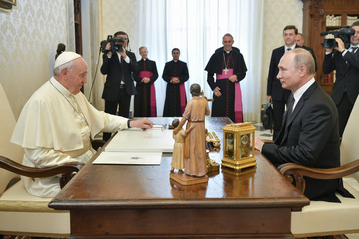 Ötvenöt percig tartott a zárt ajtók mögötti megbeszélés Ferenc pápa és Vlagyimir Putyin között csütörtökön a Vatikánban, ahol az orosz elnököt Pietro Parolin bíboros, szentszéki államtitkár is fogadta. A Vatikán rövid közleménye szerint az orosz elnök megbeszélésein szó volt az aktuális nemzetközi kérdésekről, mindenekelőtt Szíria, Ukrajna és Venezuela helyzetéről. A felek érintették az oroszországi katolikus egyházzal kapcsolatos kérdéseket, valamint a környezetvédelmet is. Vatikán Állam és Oroszország megállapodást írt alá a vatikáni Gyermek Jézus és az oroszországi gyermekkórházak közötti együttműködésről.(MTI)