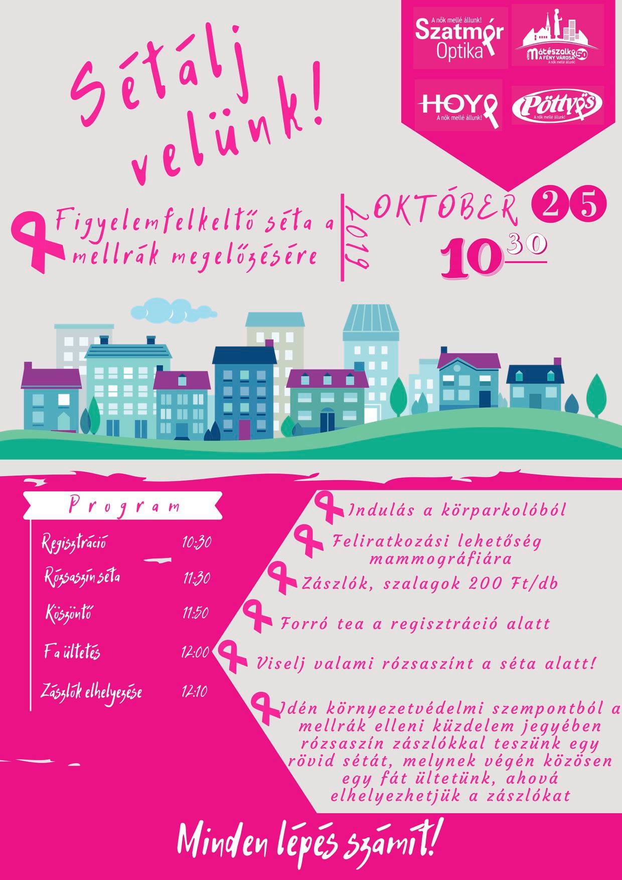 Mátészalkán figyelemfelkeltő sétát szerveznek a mellrák megelőzésére október 25-én, pénteken 10:30 órától. A program regisztrációval kezdődik, amit a rózsaszín séta követ. A résztvevőket teával várják. A szervezők kérése, hogy mindenki viseljen valami rózsaszínt a séta alatt. A rövid, figyelemfelkeltő séta végén faültetésre is sor kerül.