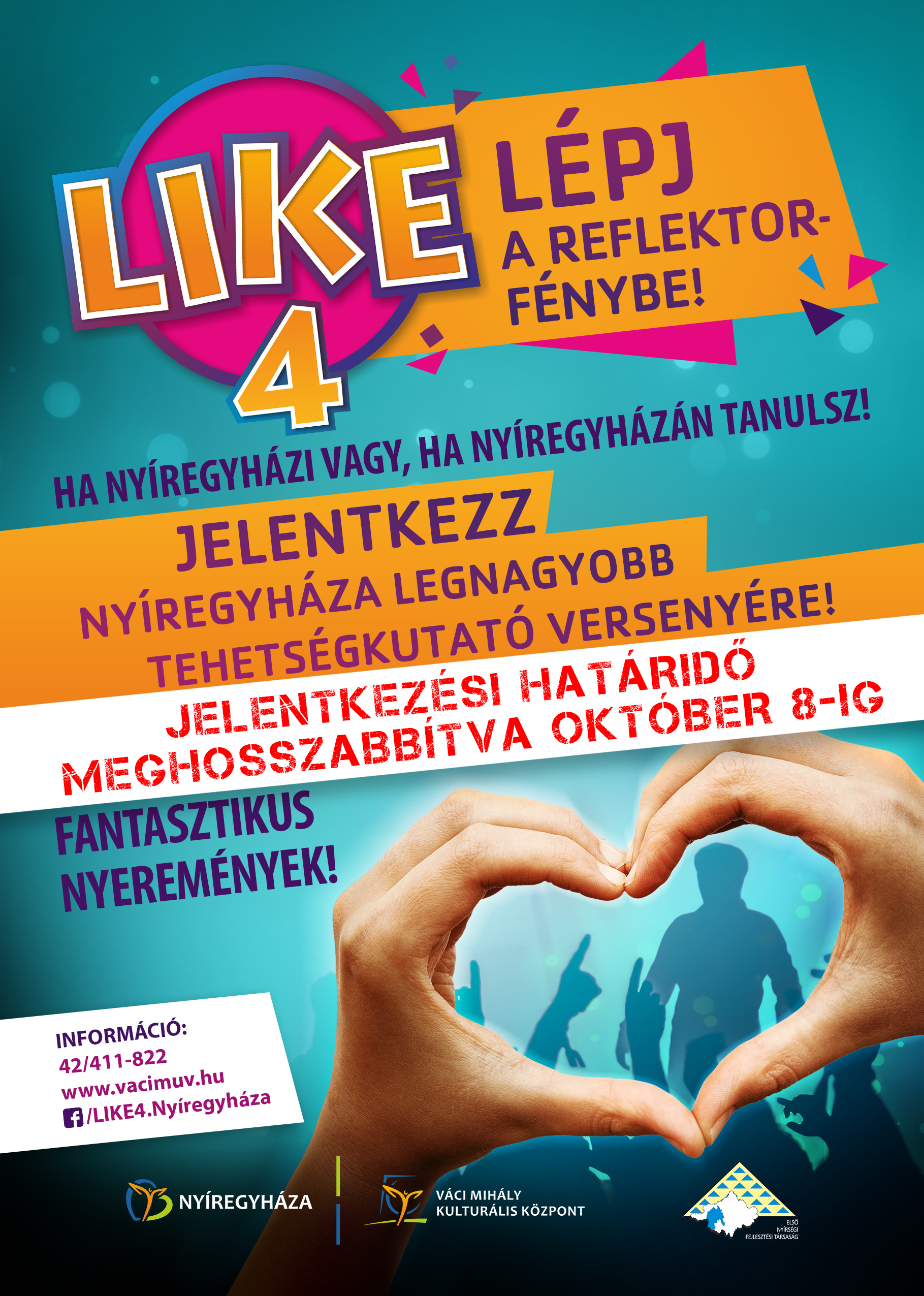 Meghosszabbították a LIKE 4 tehetségkutató jelentkezési határidejét. Az eredeti határidő szeptember 30-án járt volna le, de a szervezők úgy döntöttek, hogy kitolják a jelentkezési határidőt október 8-ig. Nyíregyháza város önkormányzata idén már negyedik alkalommal rendezi meg a Váci Mihály Kulturális Központtal közösen a város legnagyobb tehetségkutató versenyét a LIKE-ot. Ebben az évben is két kategóriában (az ének és tánc műfajában) léphetnek a zsűri elé a résztvevők. Információk a versen