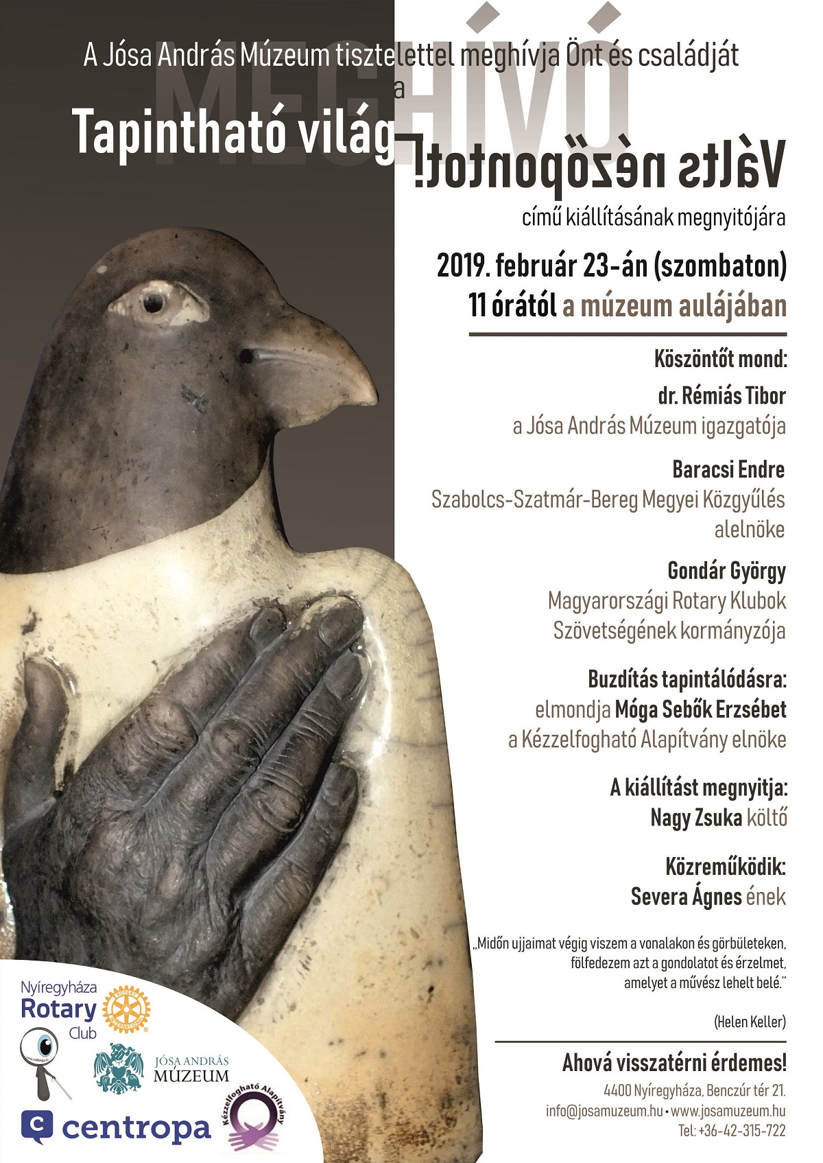 Február 23-án, szombaton újabb különleges, időszaki kiállítás nyílt a Jósa András Múzeum és a nyíregyházi Rotary Club együttműködésének köszönhetően. A Tapintható világ – Válts nézőpontot! elnevezésű tárlat egyik fő célja megmutatni, milyen sokrétű a művészet, annak értelmezése, befogadása, mennyi különböző alkotó és alkotás fér meg egymás mellett, mégis harmóniában egymással. A tapintásnak köszönhetően pedig újabb nézőpontokkal, érzésekkel, élményekkel gazdagodhatunk. Rémiás Tibor, a Jósa Andrá