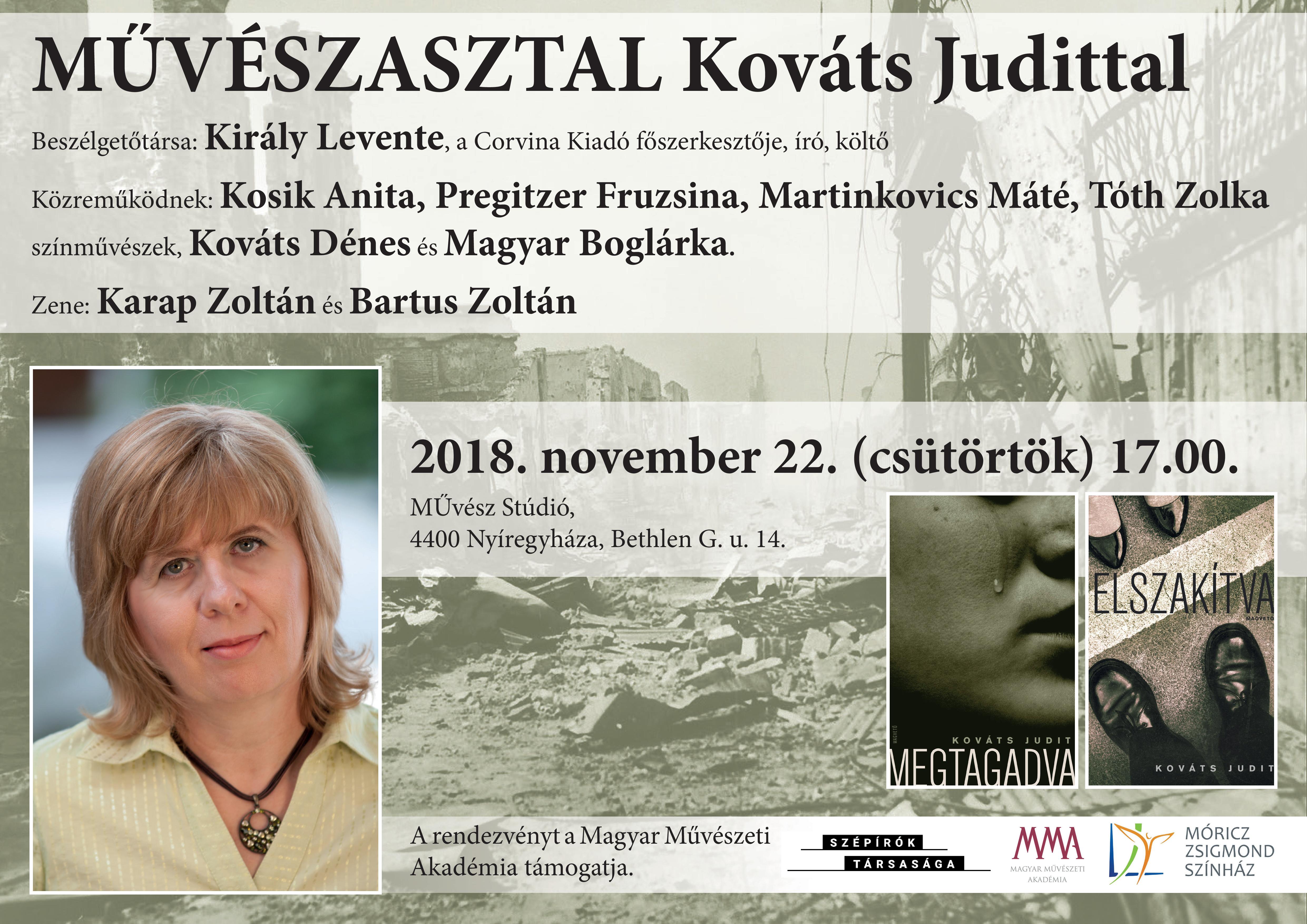 November 22-én, csütörtökön 17 órától kerül sor a Művészasztal 8. estjére, melynek különlegessége, hogy a vendég ezúttal a rendezvénysorozat ötletadó háziasszonya, Kováts Judit író, akivel Király Levente, a Corvina Kiadó főszerkesztője, író, költő beszélget a MŰvész Stúdióban (Nyíregyháza, Bethlen G. u. 14.). Az est során a Megtagadva és az Elszakítva c. regényekből színpadra állított jeleneteket láthatnak az érdeklődők Kosik Anita rendezésében. Közreműködnek Pregitzer Fruzsina, Kosik Anita, Tót