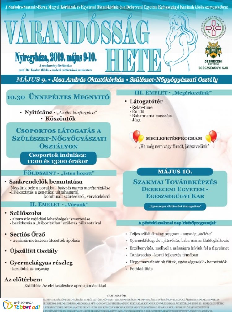 Minden év májusában nyílt nappal ünnepli a Várandósság Hetét a nyíregyházi Jósa András Oktató Kórház, melyre elsősorban a várandós anyukákat és családjaikat várják, hogy bepillantást nyerjenek a kórház szülészeti osztályának munkájába, megismerhessék a kismamákat érintő vizsgálati eljárásokat, az alternatív szülési módokat, és a csecsemő osztály mindennapi életét. Az idén május 9-én és 10-én rendezik meg a programsorozatot, melynek első napján nyitja ki kapuit az egészségügyi intézmény, és kultu