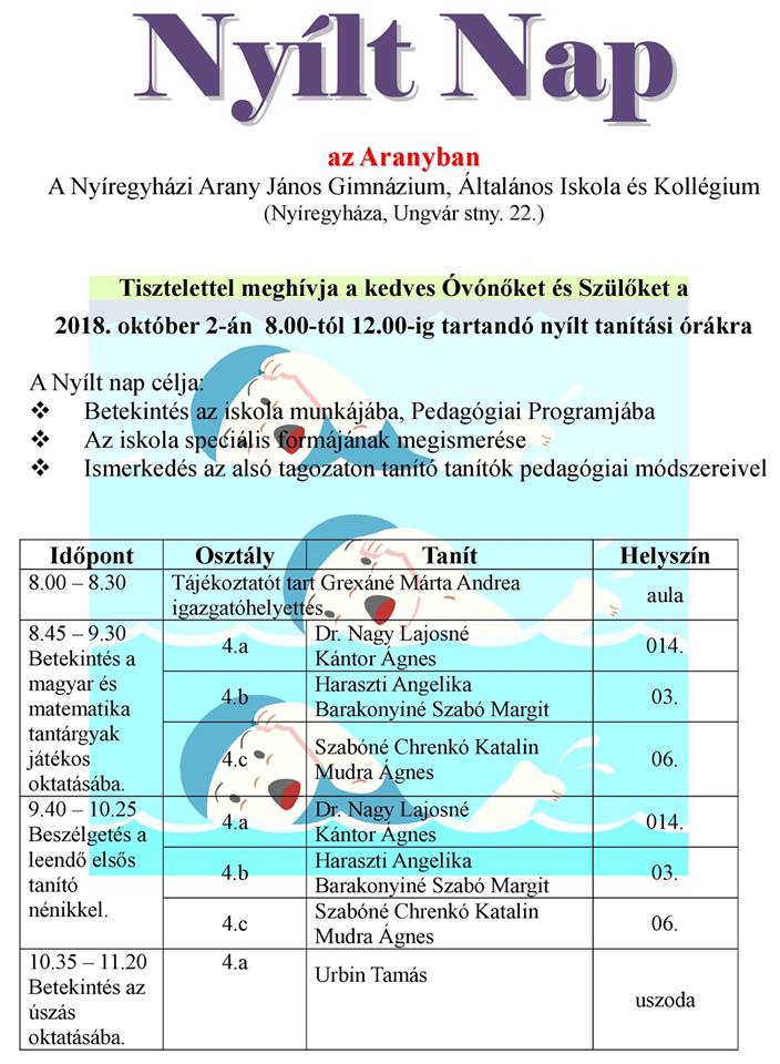 Október 2-án, kedden 8 és 12 óra között nyílt napot tart az Arany János Gimnázium, Általános Iskola és Kollégium, melyre szeretettel várják a leendő elsősöket és szüleiket. A nyílt nap keretén belül lehetőség nyílik betekinteni az iskola munkájába, pedagógiai programjába, valamint megismerkedhetnek az alsó tagozatos tanítókkal.