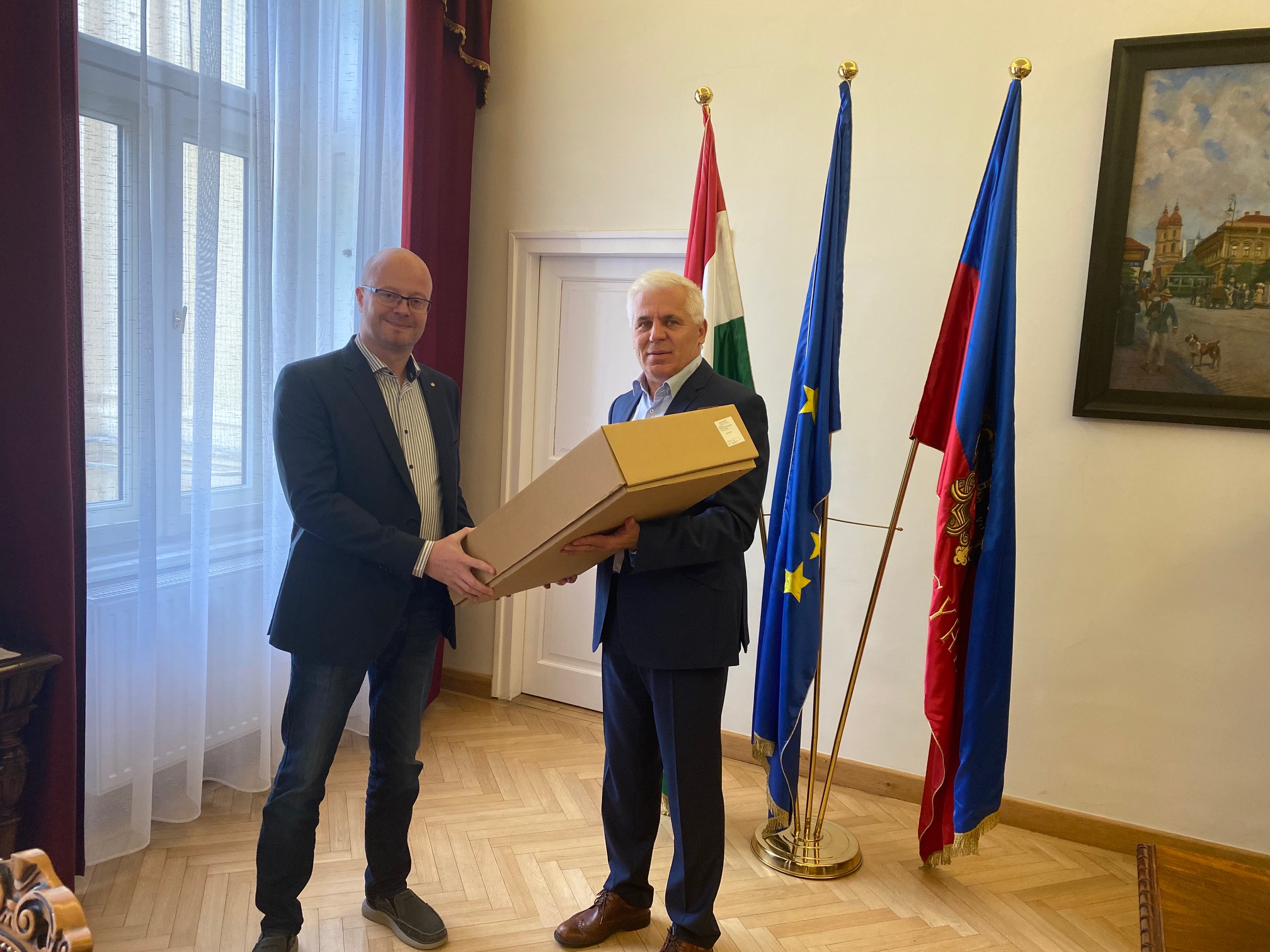 A mai napon Dr. Kovács Ferenc, Nyíregyháza polgármestere a Városházán fogadta Kereskényi Gábort, Szatmárnémeti polgármesterét. Nyíregyháza és Szatmárnémeti idén ünnepli testvérvárosi kapcsolatának 20 éves jubileumát, mégis ezúttal a járvány elleni védekezés volt a találkozó fő témája. A két polgármester egyeztetést folytatott a veszélyhelyzet tapasztalatairól és a határ két oldalán várható gazdasági hatásairól. A testvérvárosi jubileumi ünnepségre várhatóan szeptemberben kerülhet sor. Dr. Kovács Ferenc meghívta Szatmárnémeti delegációját a Tirpák Fesztiválra, egy közös ünneplésre, majd búcsúzáskor 500 db arcvédő pajzsot adományozott Szatmárnémeti önkormányzatának.