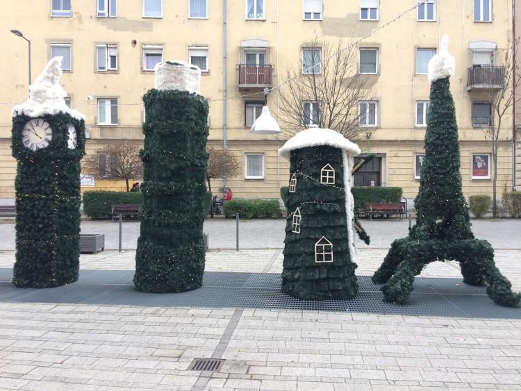 Híres épületekbe futhatunk bele Nyíregyháza belvárosában. A nem mindennapi épületegyüttest műfenyőből álmodta meg tervezőjük, és mind a négy alkotáson ragyogóan csillognak az ünnepi fények. Így még biztosan nem láttuk a londoni Big Ben-t vagy a párizsi Eiffel-tornyot. És ilyen alkotásokkal sem találkoztunk még a városban.