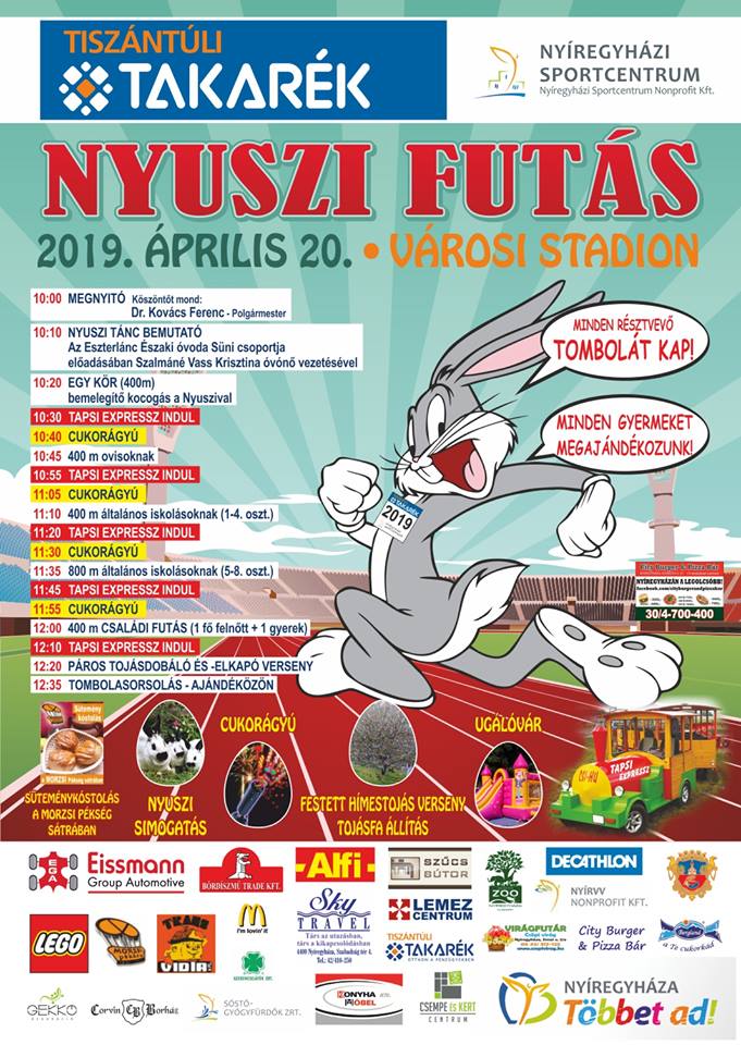 Idén is megrendezik a nagy sikerű Nyuszi Futást Nyíregyházán. Április 20-án, szombaton 10 órától szeretettel várnak mindenkit a szervezők a Városi Stadionba. A résztvevőket 400 és 800 méteres táv, valamint családi futás várja. A nap folyamán többször eldördül a cukorágyú és elindul a tapsi expressz. Lesz még továbbá nyuszi simogatás, süteménykóstolás, tombolasorsolás, ugrálóvár, tojásfa állítás, tojásdobáló, illetve -elkapó verseny.
