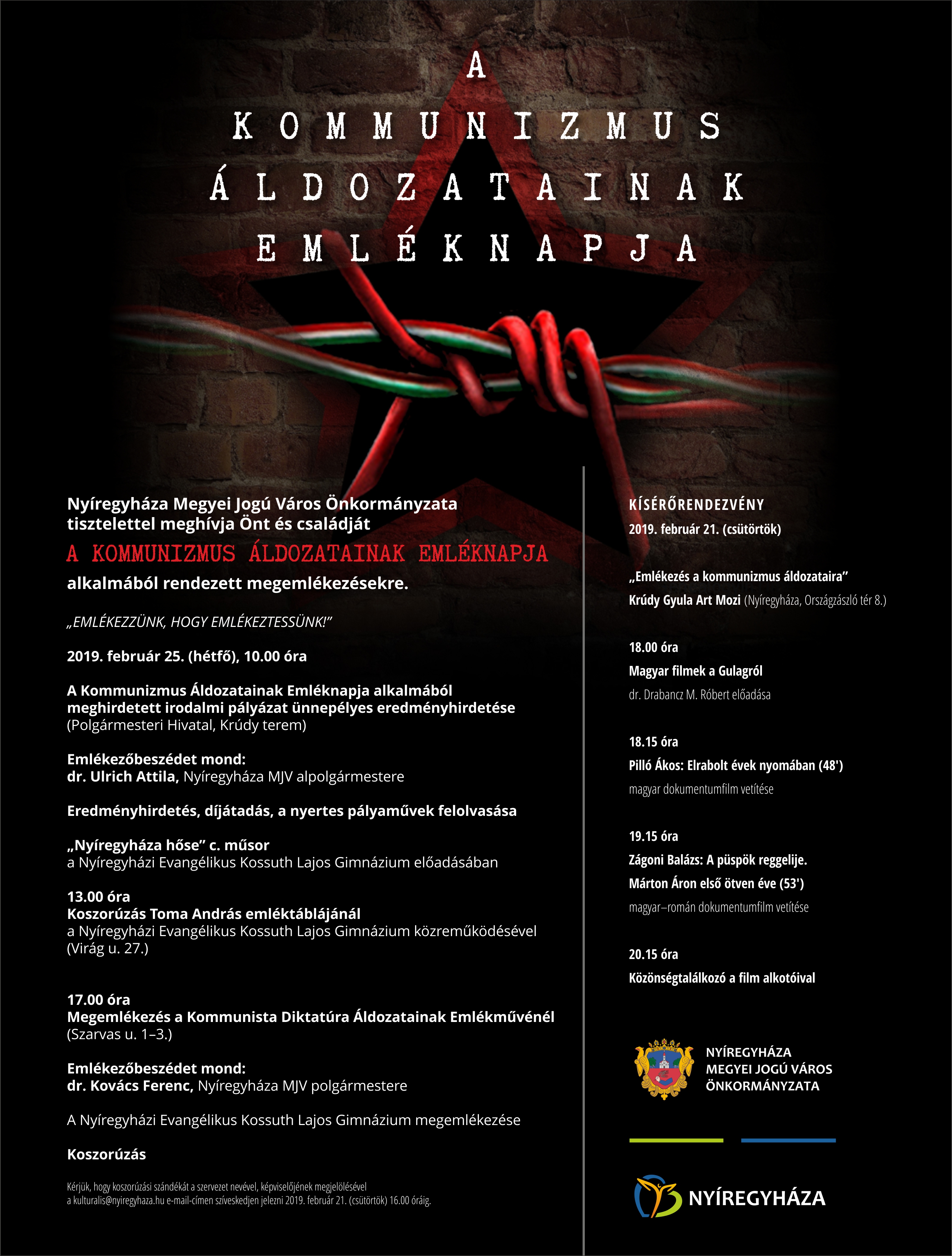 Országszerte tartanak megemlékezéseket ma, a kommunizmus áldozatainak emléknapján. A központi ünnepséget a Terror Háza Múzeumban tartják, amely az emléknapon ingyenesen látogatható. Az Országgyűlés 2000-ben nyilvánította február 25-ét a kommunizmus áldozatainak emléknapjává, annak emlékére, hogy 1947-ben ezen a napon tartóztatták le jogellenesen, majd hurcolták el a Szovjetunióba Kovács Bélát, a Független Kisgazdapárt főtitkárát. A kommunizmus áldozatainak emléknapja alkalmából vidéken is számos megemlékezést tartanak, többek között Nyíregyházán is. Városunk több pontján lesz ünnepélyes megemlékezés és koszorúzás hétfőn.