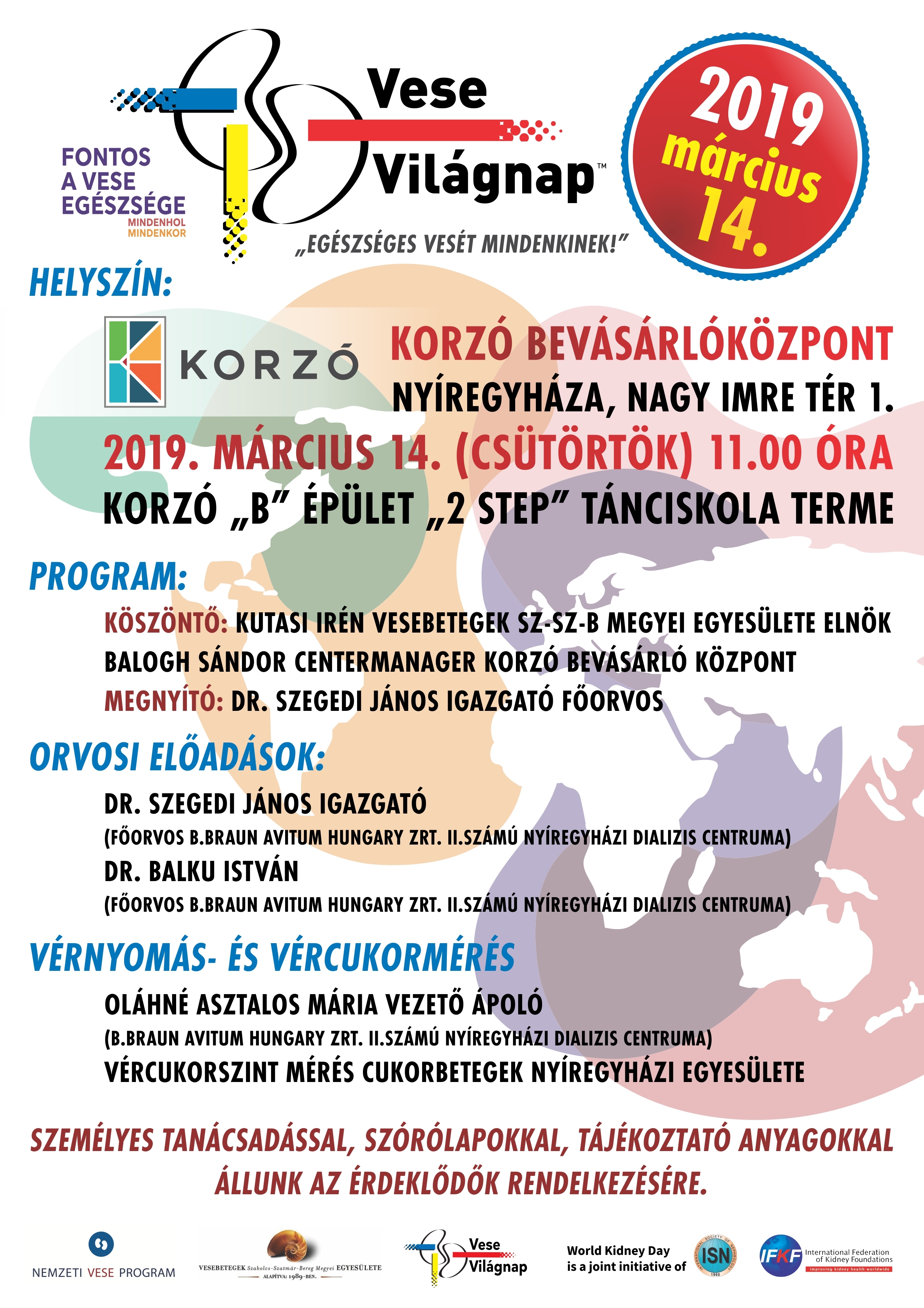 A vese bab formájú, létfontosságú páros szerv, amely percenként 1 liter vért szűr meg. A nap 24 órájában értünk dolgozik, mégsem vigyáz rá mindenki kellően. Minden év márciusának második csütörtökén tartják a Vese Világnapját, amelynek célja, hogy felhívja a figyelmet a vesék fontosságára, a vesebetegség veszélyeire és megelőzésének lehetőségeire. Hazánkban minden tizedik ember érintett valamilyen vesebetegségben, és a betegek száma folyamatosan nő. A Vese Világnapja alkalmából március 14-én 11.00 órától, a Kórzóban lakossági fórumot tartanak. Minden kedves érdeklődőt szeretettel várnak a szervezők. Az idei világnap középpontjában a globális veseegészség és megtartásának fontossága áll, mivel kellő odafigyeléssel és megfelelő életmóddal elkerülhető a vesebetegség kialakulása, vagy lassítható annak hanyatlása.