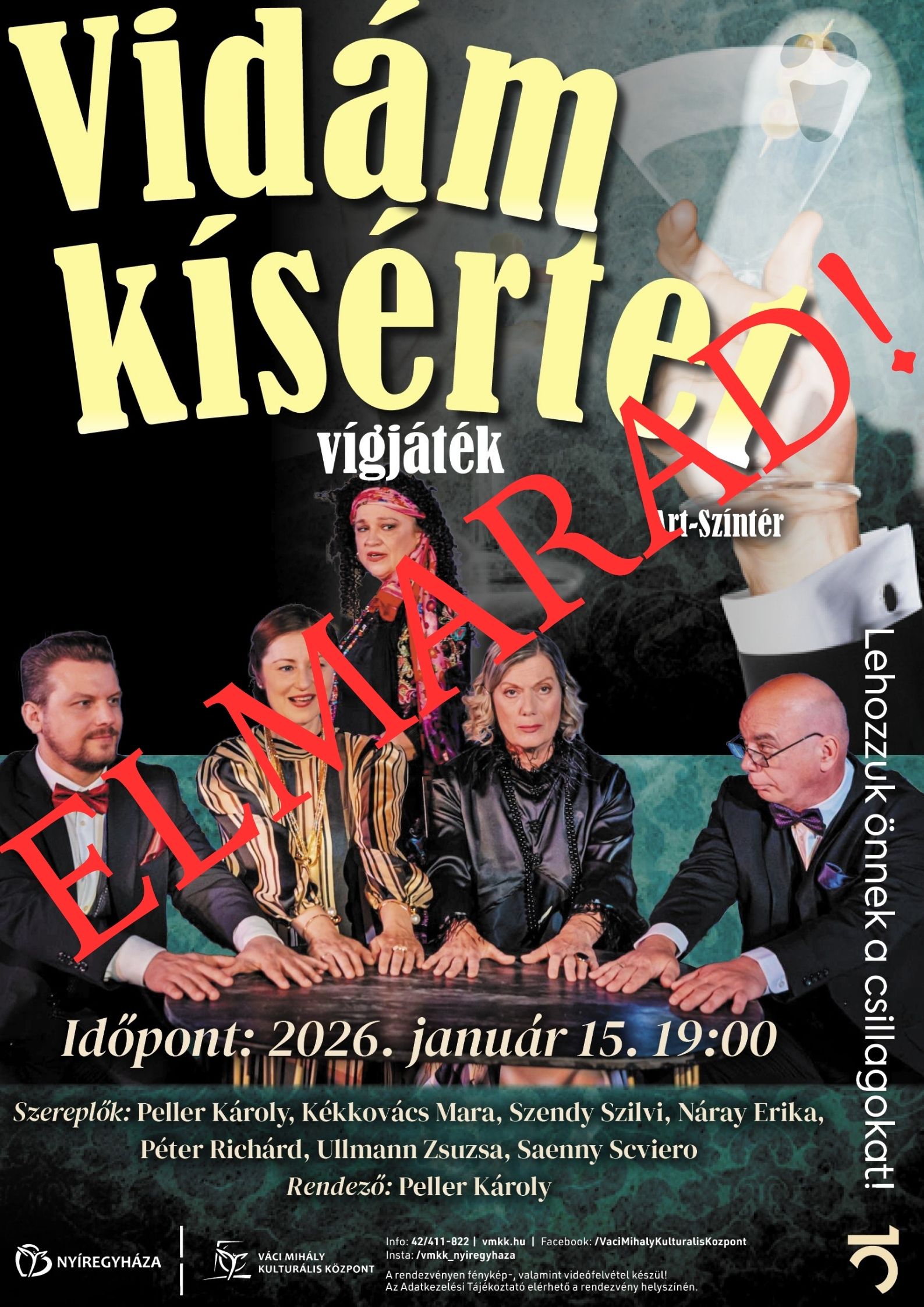 Peller Károly balesete miatt elmarad a Vidám kísértet című előadás 2026. január 15-re meghirdetett időpontja. A szervezők tájékoztatása szerint a megvásárolt jegyek automatikusan érvényesek az április 16-i Jövőre, Veled, Itt! című musicalre, amellyel a nézőknek további teendőjük nincs. Aki nem kíván élni az átfoglalás lehetőségével, január 29-ig válthatja vissza belépőjét. A személyesen vett jegyek árát a jegypénztárban térítik vissza, míg az online vásárolt belépők ellenértékét az Interticket rendszere automatikusan visszautalja a vásárlók részére. A színház és a kulturális központ kéri a közönség megértését a váratlan műsorváltozás miatt.