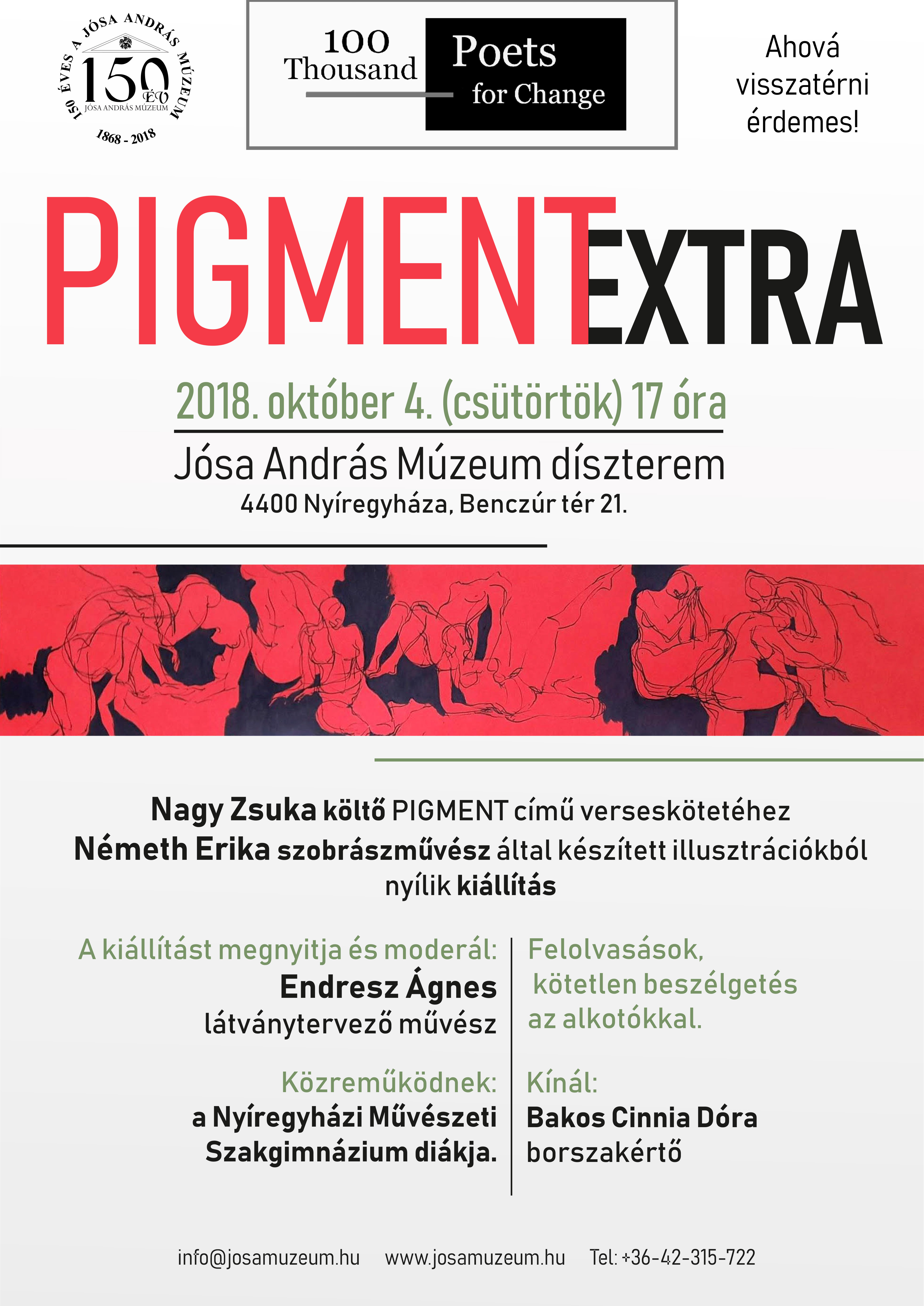 Különleges programmal várják a költészet és a képzőművészet iránt érdeklődő látogatókat október 4-én 17 órától a Jósa András Múzeumba. Az est folyamán Nagy Zsuka költő 2018-ban megjelent PIGMENT című verseskötetéhez készített grafikákat is meg lehet tekinteni. A grafikai alkotásokból rendezett kiállítást pedig Endresz Ágnes látványtervező művész nyitja meg, ezt követően kötetlen beszélgetésre nyílik lehetőség Nagy Zsukával és Németh Erika szobrászművésszel. Ezzel a programmal az est művészvendégei és a Jósa András Múzeum is csatlakozik a SZÁZEZER KÖLTŐ A VÁLTOZÁSÉRT elnevezésű nemzetközi kezdeményezéshez.