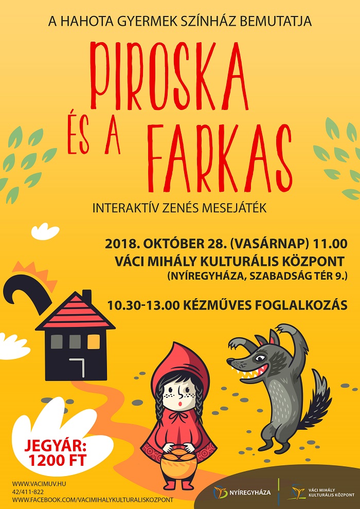Piroska és a farkas története elevenedik meg október 28-án, 11 órakor a Váci Mihály Kulturális Központban. A Grimm testvérek meséje interaktív, élőszereplős formában jelenik meg a színpadon a Hahota Utazó Gyermekszínház jóvoltából, akik az óvodás és a kisiskolás korosztályt, valamint az alsóbb tizenéveseket kívánják szórakoztatni. A gyerekeket olyan világba utaztatják, ahol akár cselekvő részesei lehetnek az eseményeknek, vagy ahol a főhős az igazságtalanságok ellen küzd. A Váci Mihály Kulturáli
