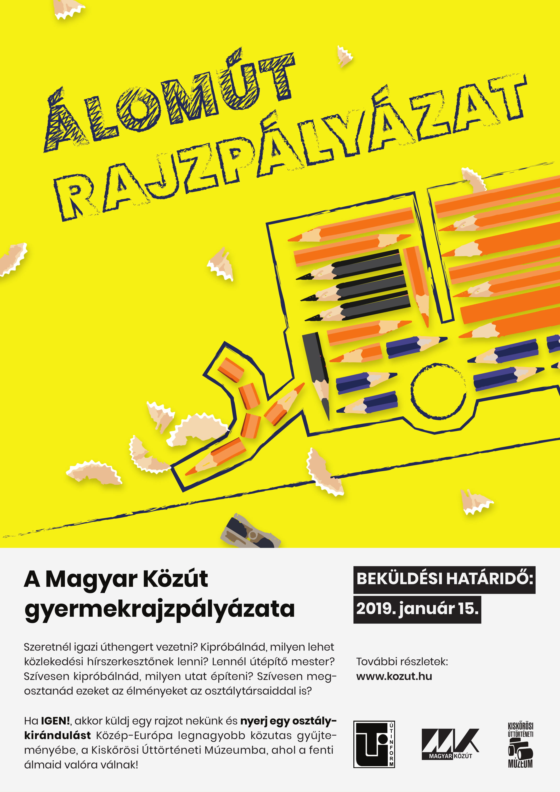 A Magyar Közút Nonprofit Zrt. 2018. év végén országos gyermekrajzpályázatot hirdetett. A társaság továbbra is olyan rajzokat vár az általános iskolásoktól, amelyek témája az utakhoz kapcsolódik. A kategóriák győztesei kirándulást nyerhetnek osztálytársaikkal együtt és a díjazott pályaműveket egy évig az útellenőri autókon láthatja az ország. Jelentkezni január 15-ig lehet. A részletes pályázati feltételek és az előző évi pályázat díjazott alkotásai, valamint az idei Álomút plakátja megtalálhatók