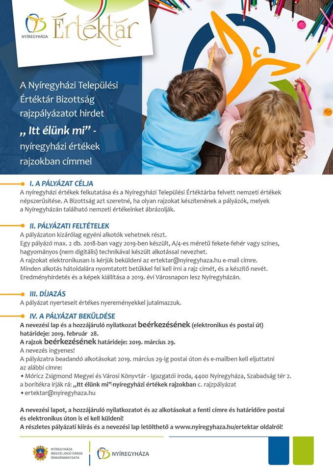 A Nyíregyházi Települési Értéktár Bizottság rajzpályázatot hirdet „ Itt élünk mi” - nyíregyházi értékek rajzokban címmel. A cél a nyíregyházi értékek felkutatása és a Nyíregyházi Települési Értéktárba felvett nemzeti értékek népszerűsítése. A Bizottság azt szeretné, ha olyan rajzokat készítenének a pályázók, melyek a Nyíregyházán található nemzeti értékeinket ábrázolják. Az alkotásokat március 29-éig várják a Móricz Zsigmond Megyei és Városi Könyvtárba. Eredményhirdetés és a képek kiállítása a 2