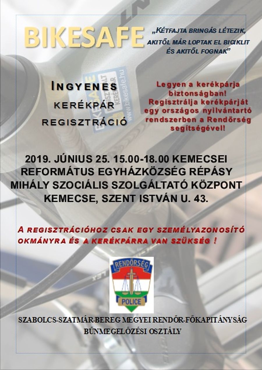 A Megyei Rendőr-főkapitányság munkatársai BikeSafe kerékpár-regisztrációra várják az érdeklődőket június 25-én, kedden 15 órától 18 óráig a Kemecsei Református Egyházközség Répásy Mihály Szociális Szolgáltató Központban. Az országos nyilvántartási rendszerbe vételhez a rendőrök lefotózzák a jelentkezők kerékpárjait, majd rögzítik a járművek egyedi jellemzőit, és a tulajdonosok adatait. A regisztrált bicikliket végül egy matricával látják el, mely azt jelzi, hogy a kétkerekű már szerepel az adatbázisban. A kezdeményezés célja, hogy lopás esetén a jelölés segítse a keresett kétkerekű azonosítását, vagy a megtalált bicikli tulajdonoshoz történő visszajuttatását.
