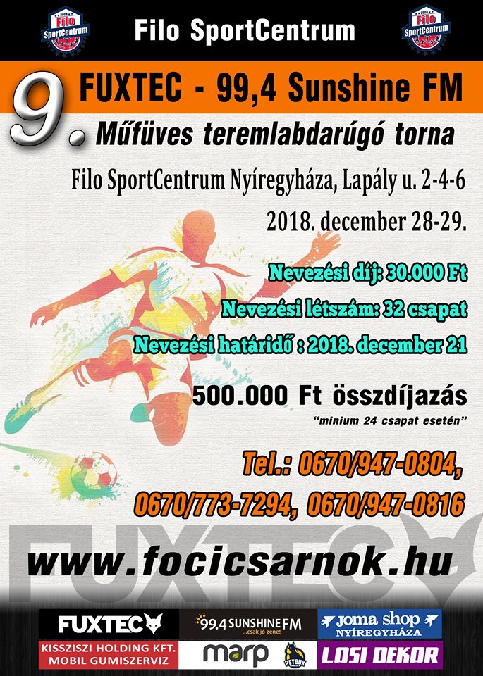 36 csapat, 3 nap, 71 mérkőzés, több, mint 400 labdarúgó. Ezekkel a számokkal jellmezhető a december 27. és 29. között megrendezett, immár 9. Fuxtec-Sunshine műfüves teremlabdarúgó torna. 9 négyes csoportból az első két helyezett jut tovább. A torna pikantériáját a műfüves borítás, a nagyméretű 5x2 méteres kapu és a palánkos játék adja. Rekordszámú nevezés érkezett már a nevezési határidő lejárta előtt. A torna komolyságáról a Magyar Labdarúgó Szövetség Sz-Sz-B megyei Igazgatóságának hivatalos játékvezetői gondoskodnak. A fuxtec.hu, a Kissziszi Holding Kft., a Petbox Állateledel és a Sunshine Fm jóvoltából, komoly jutalmakért folyik a küzdelem. A pénzdíjak mellett az első helyezett csapat 150.000 Ft értékű reklám lehetőséget kap a 99,4 Sunshine Fm-től.