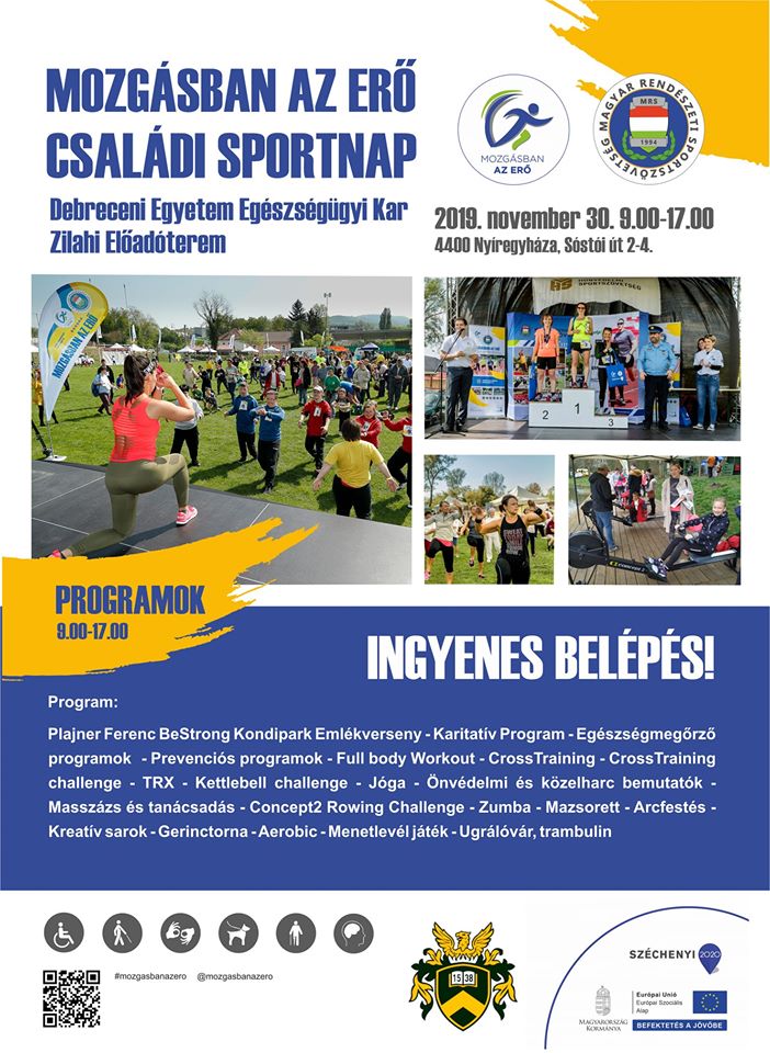 A Magyar Rendészeti Sportszövetség „Mozgásban az erő” – címmel sportnapot tart november 30-án, szombaton 9 és 17 óra között Nyíregyházán, a Debreceni Egyetem Egészségügyi Karán. Az ingyenes rendezvény célja, a szabadidősport tevékenységek elterjesztése, a lakosság egészségi állapotának javítása a helyi szinteken működő sportegyesületek tevékenységének összehangolásával. Az ünnepélyes megnyitó után kezdetét veszi a Plajner Ferenc BeStrong Kondipark Emlékverseny, de sportprogramok, egészségmegőrző, prevenciós és kreatív programok is várják az érdeklődőket.