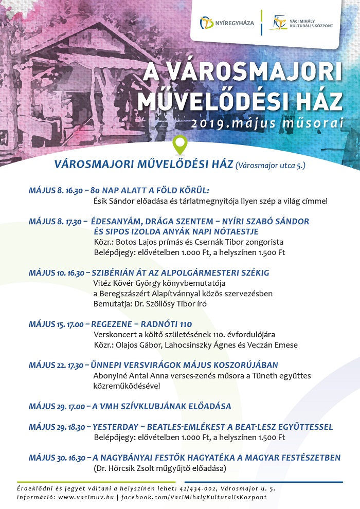 Szerény külsővel, de annál színesebb kulturális élettel várja Nyíregyháza lakóit májusban is a Városmajori Művelődési Ház. Az itt működő klubok, csoportok, a különböző mozgásformákra épülő foglalkozások mellett minden hónapban változatos rendezvényeket is szerveznek. Májusban is koncertek, könyvbemutatók, szívklub várja az érdeklődőket, de folytatódik a 80 nap alatt a földkörül programsorozat is, melynek vendége május 8-án Ésik Sándor lesz. Ugyan ezen a napon 17.30-kor egy más műfaj szerelmeseit