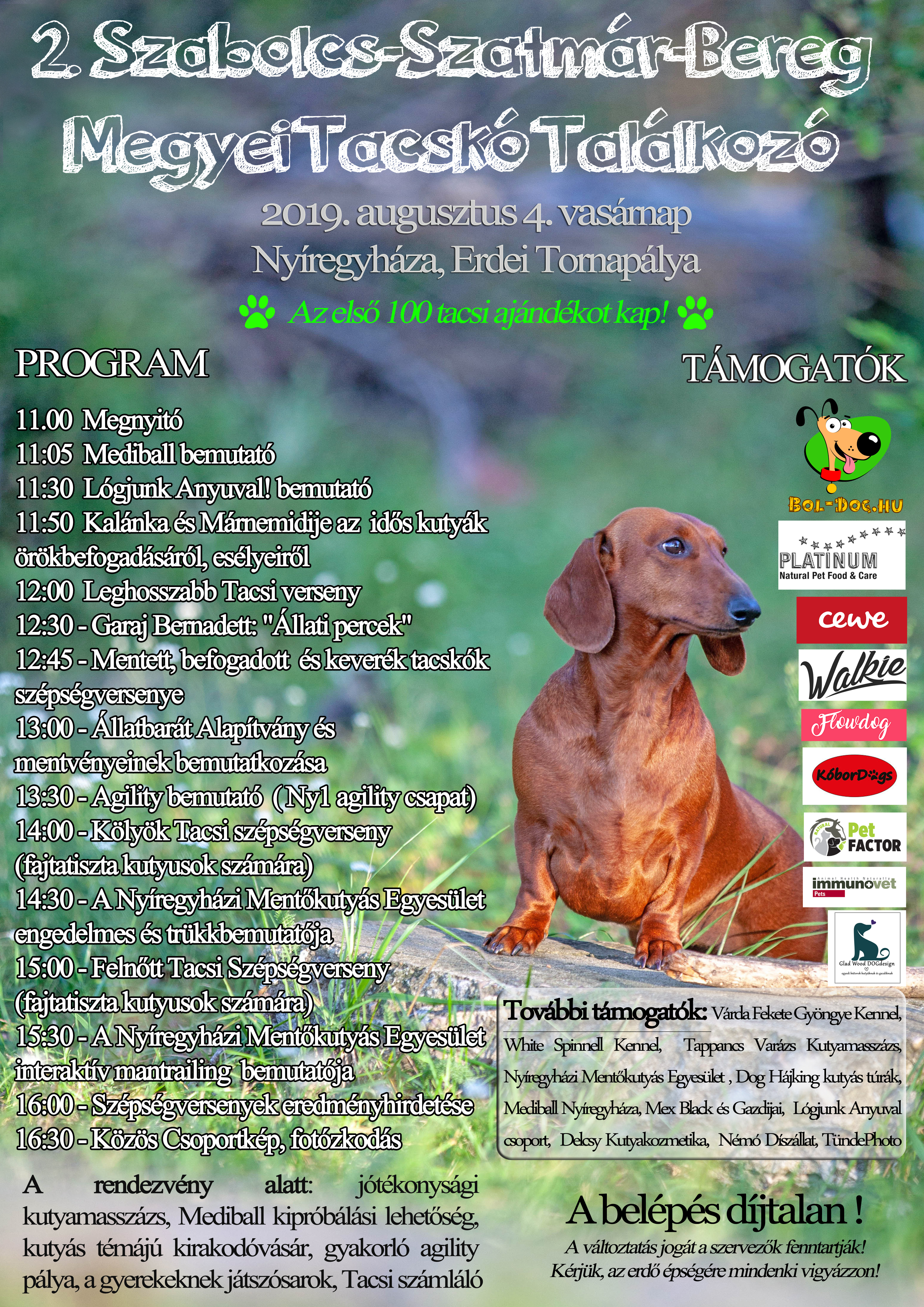 Augusztus 4-én, vasárnap ismét összegyűlnek Szabolcs megye tacskói, valamint tacskókedvelői. Ezúttal a helyszín Nyíregyháza lesz, méghozzá az Erdei Tornapálya, ahol 11-től egészen 17 óráig lesznek kutyás programok. Az előzetes felmérés alapján nem csak Nyíregyházáról és más megyei városból érkeznek majd a rendezvényre: jelezték részvételi szándékukat Hajdú-Bihar és Borsod-Abaúj-Zemplén megyéből, de még Budapestről és Békéscsabáról is.