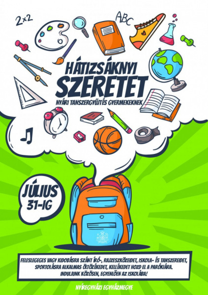 Hátizsáknyi szeretet címmel tanszergyűjtést szervez a Nyíregyházi Egyházmegye hátrányos helyzetű gyermekek számára. A feleslegessé vált vagy kidobásra szánt, de még használható író-, rajzeszközöket, iskola- és tanszereket, sportolásra alkalmas öltözéket, kellékeket a parókiákon lehet leadni július 31-ig. Az adományokat olyan tanulókhoz juttatják majd el, akik hátránnyal indulnak a következő tanévben.