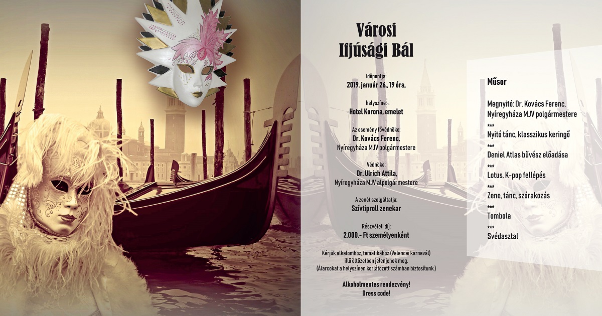 Mint a nagyok, úgy bálozhat az a száz fiatal, aki elfogadta a Diákpolgármesteri Iroda és a Mustárház meghívását január 26-ára, a Korona Hotelbe. Az első Városi Ifjúsági Bálon ugyanis a hagyományos forgatókönyv szerint nyitótáccal indul az est, és nem dj, hanem élő zenekar a Szívtiproll szolgáltatja majd a zenét. A résztvevők igazi karneváli hangulatban tölthetik el majd az estét, hiszen az idei bál témája a Velencei karnevál, így nem lesz hiány nagy szoknyákban, maszkokban és álarcokban sem – tu