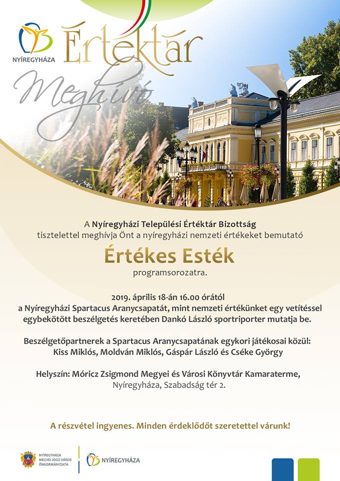 Újabb Értékes Este városunkban. A Nyíregyházi Települési Értéktár Bizottság szervezésében, a nyíregyházi nemzeti értékeket bemutató Értékes Esték programsorozat újabb eseményén a Nyíregyházi Spartacus Arany Csapatát, mint nemzeti értékünket egy vetítéssel egybekötött beszélgetés keretében Dankó László sportriporter mutatja be április 18-án, csütörtökön 16.00 órától, a könyvtár kamaratermében. Beszélgető partnerek a Spartacus Arany Csapatának egykori játékosai közül Kiss Miklós, Moldván Miklós, G