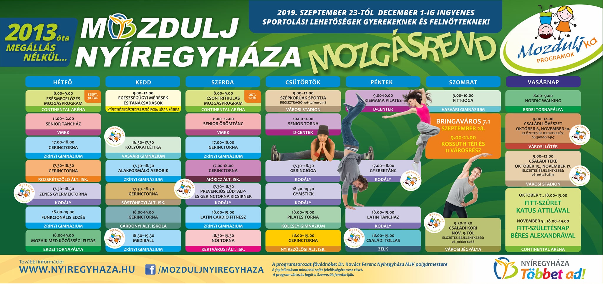 2013 óta megállás nélkül zajlik a városban a Mozdulj Nyíregyháza! programsorozat. Most még több programmal, újabb helyszínekkel várják a szervezők a városlakókat. Szeptember 23-tól december 1-ig mozoghatnak újra a nyíregyháziak. Az érdeklődőket többek között gerinctorna, fitt-jóga, aerobik, mediball vagy latin és senior táncház is várja. A szervezők gondoltak a gyerekek megmozgatására is. De lesznek egészségügyi szűrések és tanácsadások is. Idén is lesz Bringaváros 7.1, szeptember 28-án. Október
