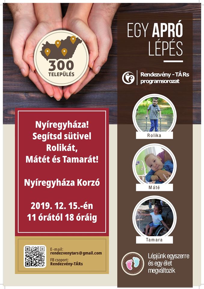 Sütivásár rendeznek december 15- én 11 órától Nyíregyházán, a Korzó Bevásárlóközpont "A" epületeben. Az „Egy apró lépés” csapatának országos kampánya már korábban is sikeres volt és két gyermek életminőségének javításához tudtak hozzájárulni, ezúttal pedig újabb három apróság megsegítésére fogtak össze. A szervezők várják a felajánlásokat, házi készítésű, vagy cukrászdai süteménnyel is hozzá lehet járulni a jótékonysági akcióhoz, melyet vasárnap 11 órától lehet a helyszínre vinni, ugyanis a felajánlásokért süteményt adnak az Egy apró lépés önkéntesei.