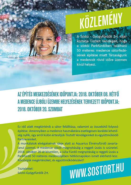 A Sóstó-Gyógyfürdok Zrt. tájékoztatja vendégeit, hogy a Parkfürdoben található 50 méteres medence sátorfedésének építése miatt a medencét rövid idore üzemen kívül helyezik. Az építést október 8-án, hétfon kezdik meg. A medence újbóli üzembe helyezésének tervezett idopontja október 20., szombat. Ez ido alatt megtörténik a sátor felállítása, az összeköto folyosó építése, valamint kisebb burkolatjavítási, karbantartási munkák elvégzése, illetve a medence teljes vízcseréje is. A munkálatok elvégzésé