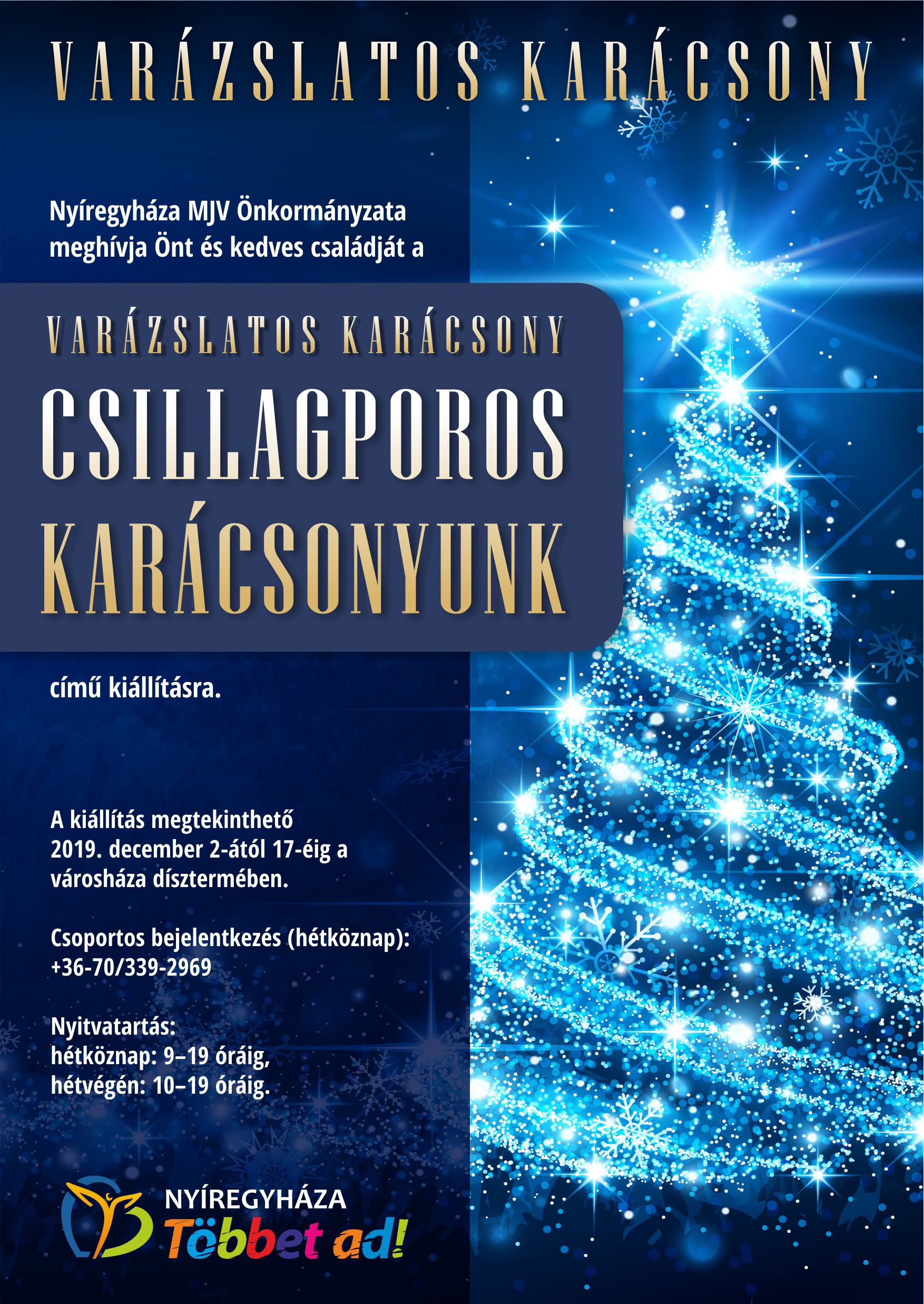 Átalakult Nyíregyházán a Városháza, ugyanis az ingyenesen látogatható „Csillagporos karácsonyunk…” című kiállításon karácsonyi enteriőröket láthatnak a Városháza Krúdy termében a látogatók. A karácsonyi hangulatokat Gerliczki Zoltán mestervirágkötő és csapata álmodta egységbe. A kicsiket modellvasút, Szatmári Istvánné saját tervezésű babái, macik várják, míg a nagyokat karácsonyi dekorációs ötletek és Nádas Hajnalka különleges mézeskalácsai és tortái bűvölhetik el. Öt féle ünnepi díszítésben láthatunk karácsonyi hangulatot idéző fenyőfákat. A kiállításra szeretettel várnak minden kedves érdeklődőt december 17-ig.