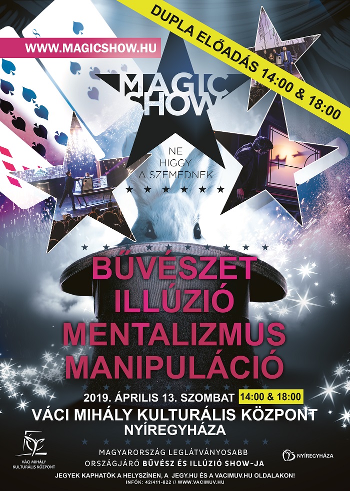 Magyarország leglátványosabb országjáró bűvész és illúzió előadása érkezik Nyíregyházára április 13-án, szombaton a Váci Mihály Kulturális Központba. Egy kivételes turnéra, kivételes művészek gyűltek össze, hogy olyat mutassanak az országnak, amilyet még sohasem láthattak. Bűvészet, illúzió, gondolatolvasás, manipuláció és még számos a tudomány által megmagyarázhatatlan produkció. A Magic Show Magyarország első olyan országjáró bűvész és illúzió műsora, amely 2018-ban 22 előadással és több mint 10.000 nézővel szórakoztatta a fiatalokat és időseket egyaránt 16 különböző városban. A kivételes érdeklődésre való tekintettel 2019-ben 35 állomásos turnéval készülnek és vadonatúj műsorral. Mészáros Szilárd, a Váci Mihály Kulturális Központ igazgatója rádiónknak elmondta, a nagy érdeklődésre való tekintettel Nyíregyházán is két előadással készülnek.