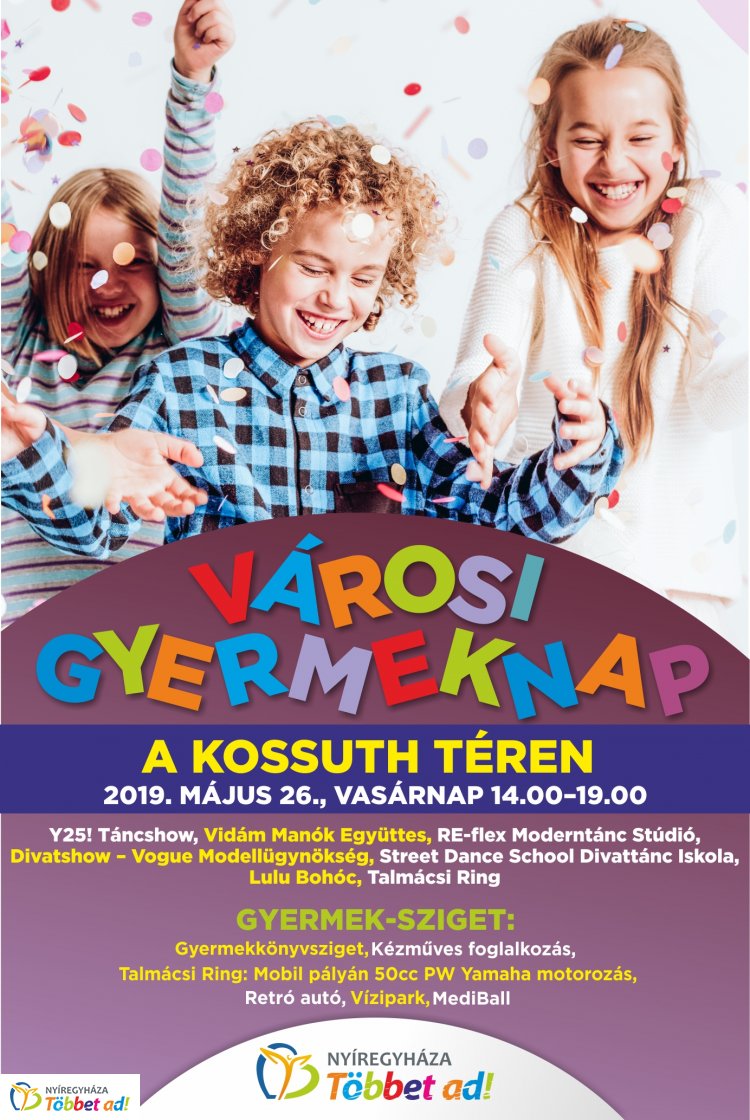 Nyíregyháza önkormányzata Városi Gyermeknapra várja a családokat május 26-án délután, a Kossuth térre. A programok felhőtlen kikapcsolódást ígérnek gyerekeknek és felnőtteknek egyaránt. A programok délután két órától kezdődnek a város szívében, ahol színesebbnél színesebb programok fogadják majd a kilátogató gyerekeket és szülőket. Lesz táncshow, divatshow, Lulu bohóc és a Vidám Manók Együttes, illetve a programok mellett külön gyermeksziget is megtalálható lesz a Kossuth téren, ahol gyermekkönyvsziget, kézműves foglalkozások, vízipark, Mediball, Retro autók és a Talmácsi Ring mobil pályája várja a kicsiket.