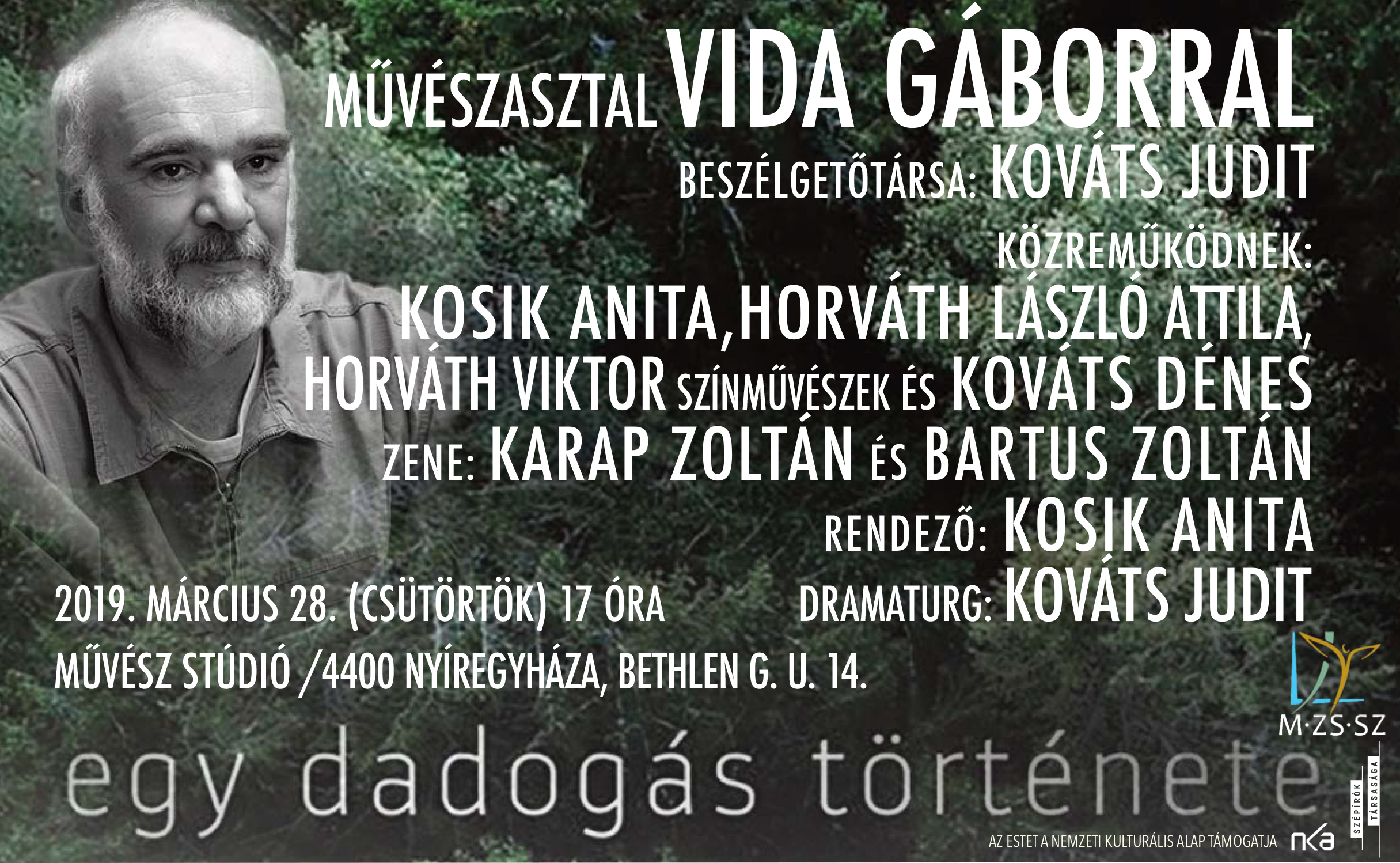 Március 28-án, csütörtökön 17 órától kerül sor a MŰVÉSZASZTAL következő estjére, melyre a kortárs magyar irodalom egyik sikeres szerzője, Vida Gábor Marosvásárhelyről érkezik Nyíregyházára. Vida Gáborral az est háziasszonya és dramaturgja, Kováts Judit beszélget majd a MŰvész Stúdióban. A különleges, koncepcióját tekintve is egyedinek mondható MŰVÉSZASZTAL célja, hogy a magyar írók, drámaírók színe-javát bemutassa Nyíregyházán, de a szokásostól eltérő módon: nemcsak beszélgetve velük, hanem