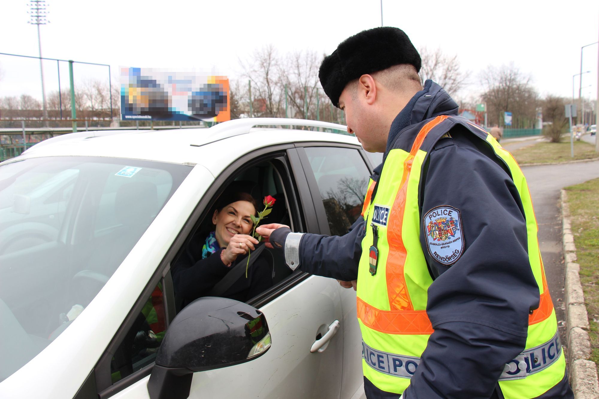 Virággal köszöntötték a szabályosan közlekedő női járművezetőket a megyebeli rendőrök