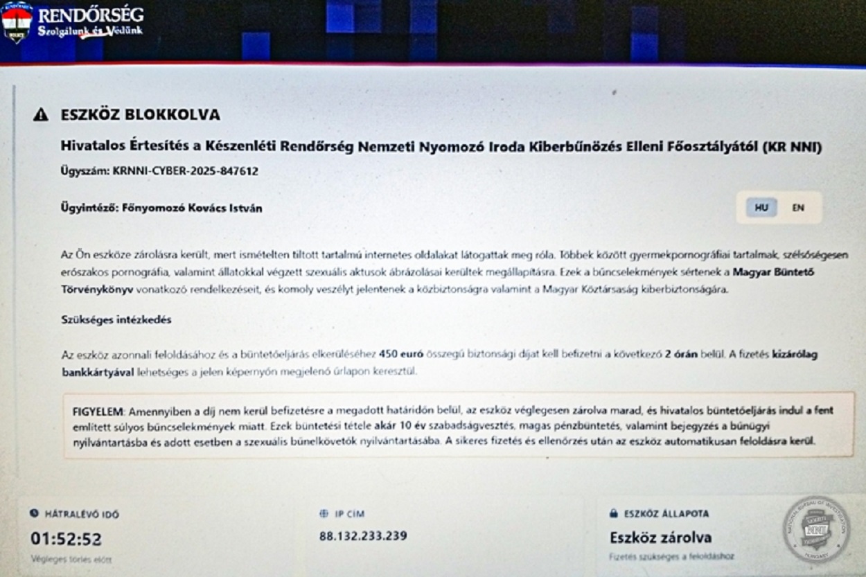 A rendőrség arculati elemeit és a hivatalos honlaphoz megtévesztésig hasonló felületet használnak internetes csalók, hogy pénzt csaljanak ki a gyanútlan felhasználóktól. Az adathalászok zsaroló e-maileken keresztül irányítják az áldozatokat egy olyan oldalra, amely azt hazudja, hogy az eszközt hatósági intézkedés keretében blokkolták jogsértő tartalom látogatása miatt. A hamis üzenet szerint a zárolást csak több száz eurós bankkártyás fizetés ellenében oldják fel, miközben a csalók célja valójában a pénzügyi adatok megszerzése. A Készenléti Rendőrség szerint ilyen esetben a legfontosabb teendő a böngésző azonnali bezárása, a fizetés megtagadása és a csalási kísérlet bejelentése a rendőrségnek.
