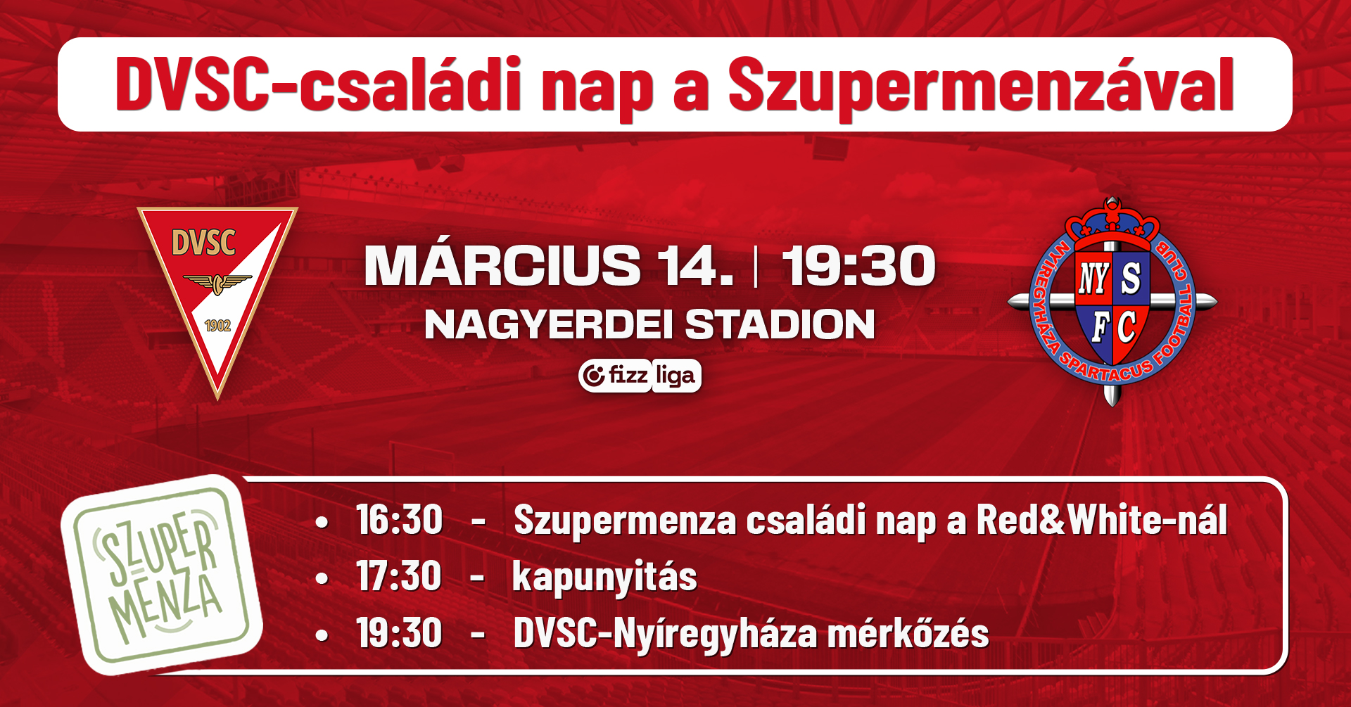 Látványos családi programokkal és gasztronómiai különlegességekkel várja a szurkolókat szombaton a Debrecen–Nyíregyháza rangadó a Nagyerdei Stadionban. A 19:30 órakor kezdődő mérkőzés előtt már fél öttől elindul a szórakoztatás: a Szupermenza Roadshow keretében FördősZé receptjeit kóstolhatják meg az érkezők, a gyerekeket pedig freestyle show, tortázás és ügyességi versenyek szórakoztatják. Fontos információ, hogy a környéken már déltől megállási tilalom lesz érvényben, 17:00 órától pedig teljesen lezárják a Nagyerdei körút egy szakaszát. A meccsre érvényes jeggyel rendelkezők délután fél öttől üzemzárásig díjmentesen vehetik igénybe a DKV járatait.