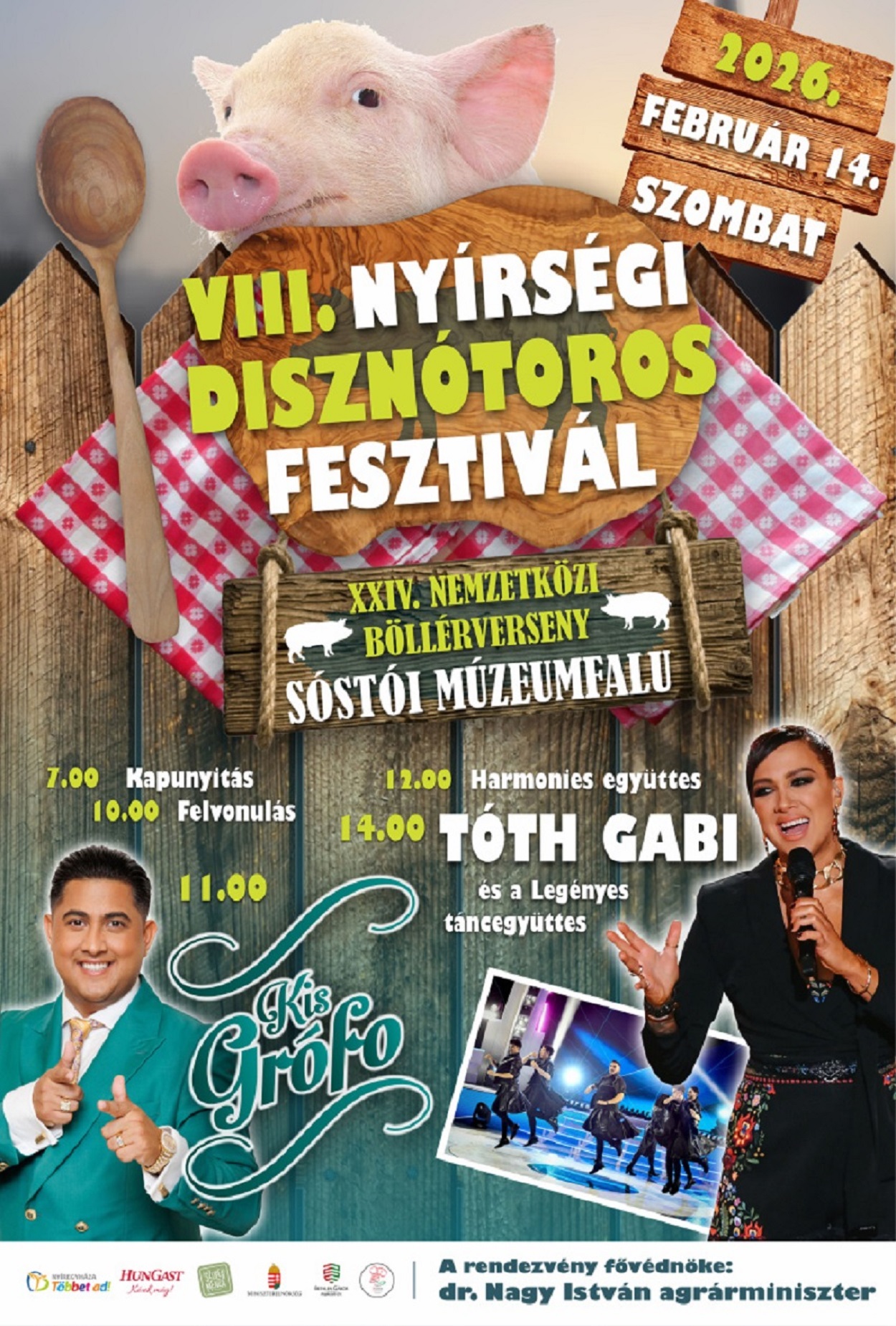 Hurka kolbász, tepertő és fergeteges hangulat várja a látogatókat február 14-én a Sóstói Múzeumfaluban, ahol nyolcadik alkalommal rendezik meg a Nyírségi Disznótoros Fesztivált. A rendezvényen a gasztronómia kapja a főszerepet, hiszen a 24. Nemzetközi Böllérversenyen mérik össze tudásukat a csapatok, miközben a színpadon olyan fellépők váltják egymást, mint Kis Grófo, Tóth Gabi és a Legényes Táncegyüttes. A hagyományőrző mulatság délelőtt 11 órakor indul, és egész napos élményt kínál a látogatóknak. A szervezők szerint a disznótor nemcsak étel, hanem igazi közösségi ünnep, ahol a friss falatok mellé zene és tánc is párosul a tél utolsó nagy mulatságán.